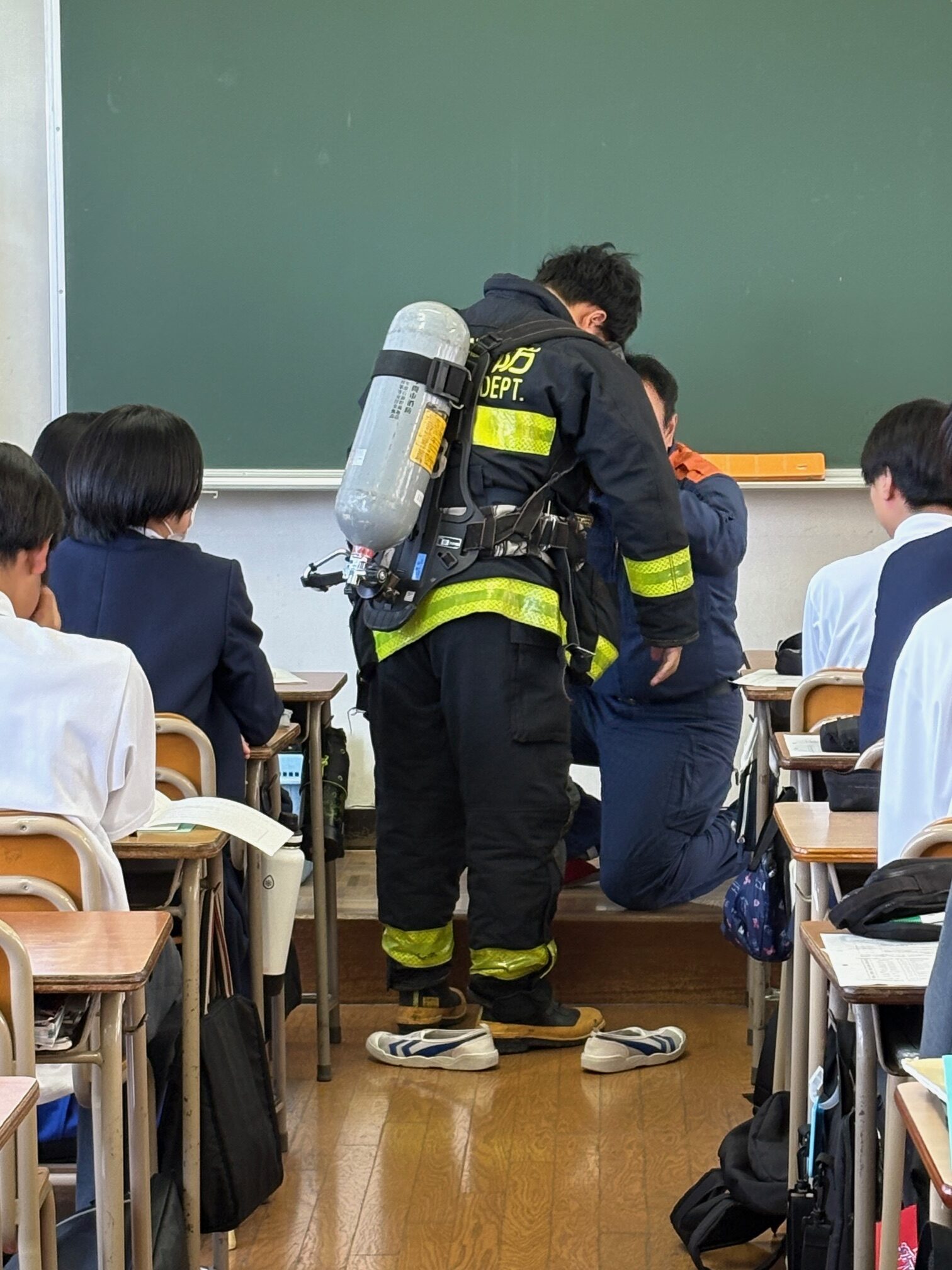 また、消防署の方が実際に消火活動時に着用している服一式を持参され、試着体験をした生徒は想像以上の重量に驚いていました。